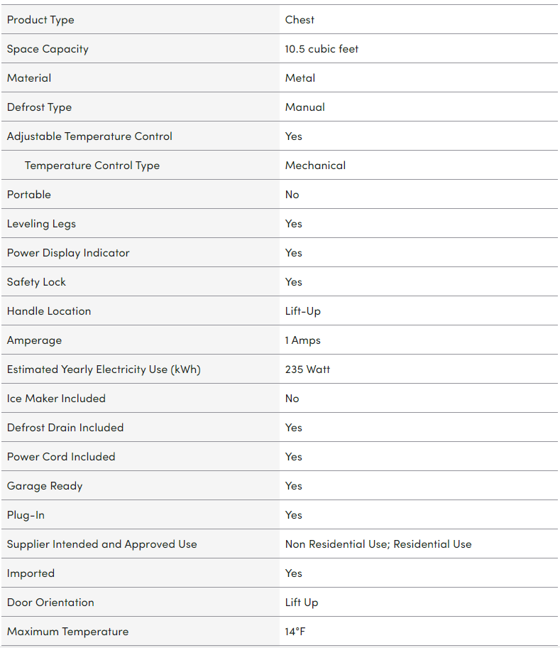 10.5 Cubic Feet Garage Ready Chest Freezer with Adjustable Temperature Controls