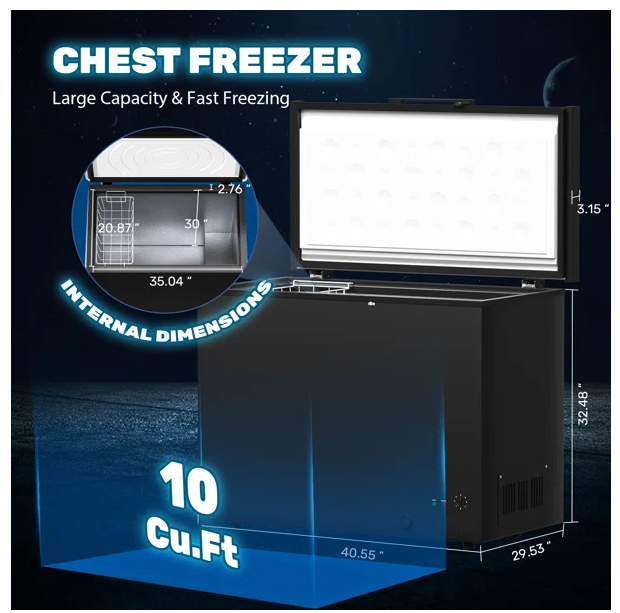 - Compact & Capacious: The 10.5 cubic feet chest freezer, measuring 40.7"(L) x 29.5"(W) x 33.5"(H), offers ample storage while occupying minimal space. This large-capacity freezer provides valuable storage solutions for kitchens, restaurants, and residents. It's not just a business necessity, but also an efficient storage addition for homes.