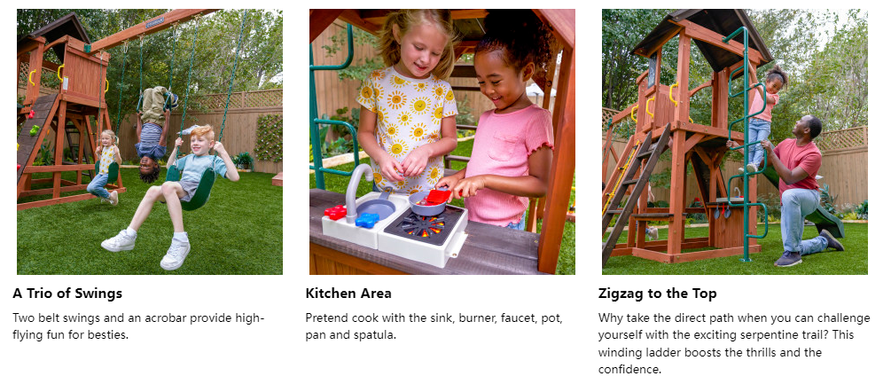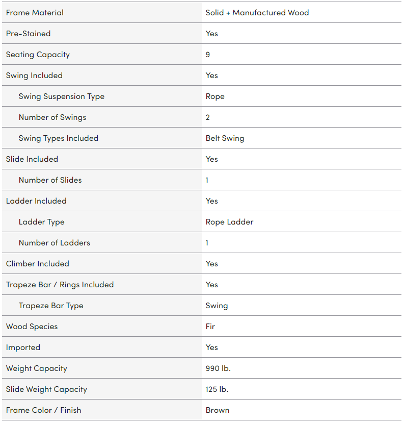 - Two belt swings and an acrobar provide plenty of room for friends to share the air
