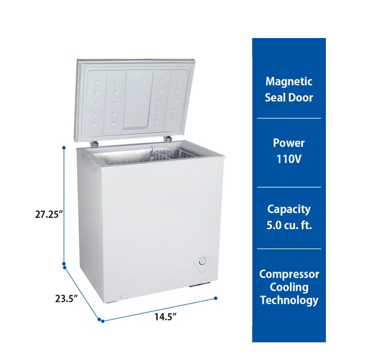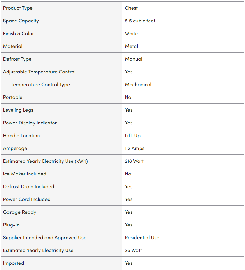 - 5.5 cu ft (155 L) Capacity: Space-saving flat-back deep freeze with a narrow footprint and 5.5 cubic foot (155 liters) capacity offers plenty of storage for your frozen goods so you can reduce food waste and save money