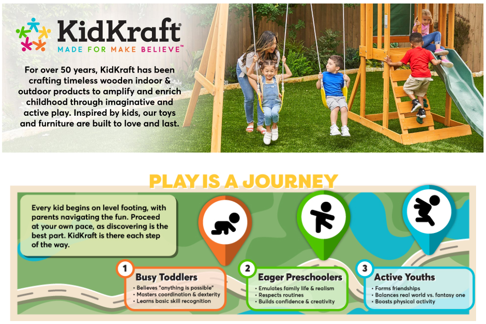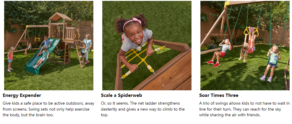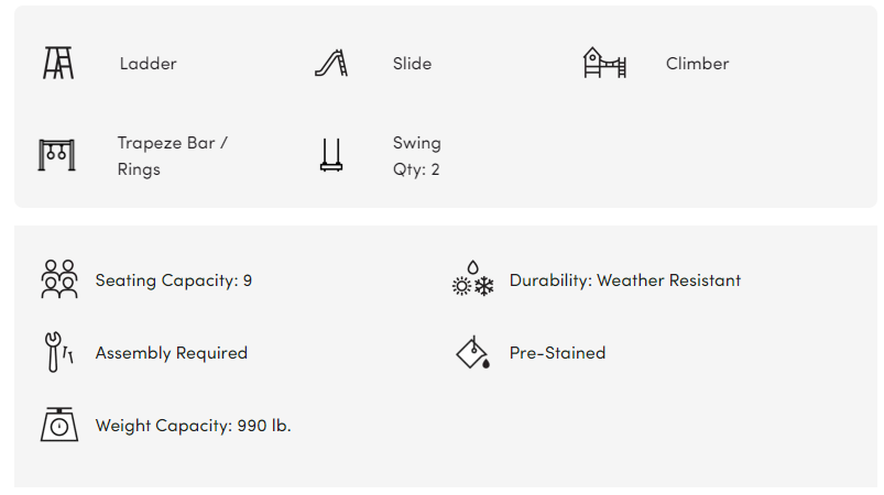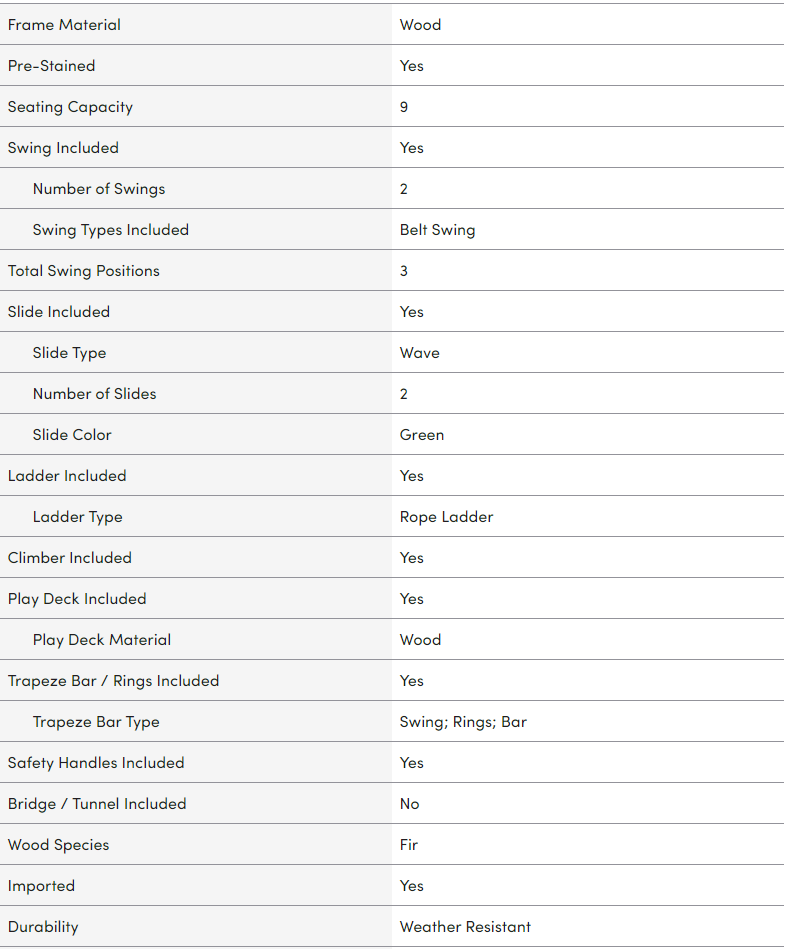 • Grow-with-child climbing options (ladder, rock wall, and cargo net)